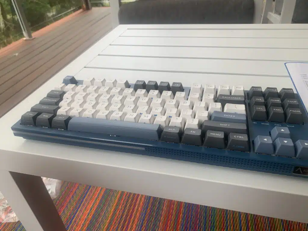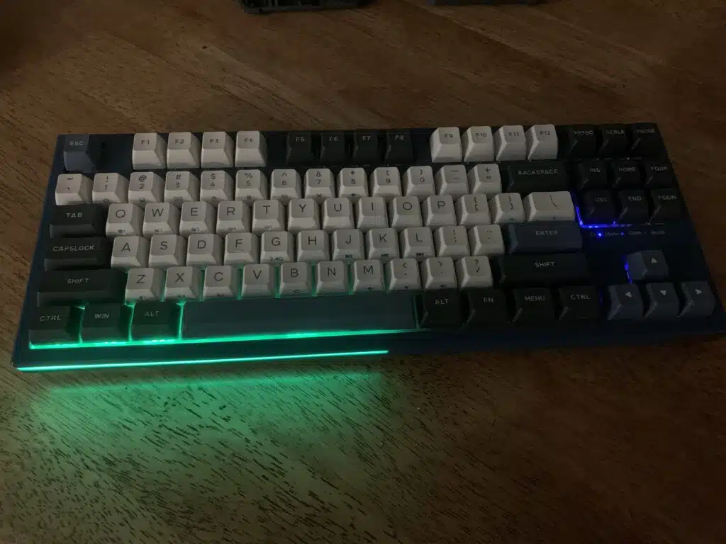 The main thing that stands out to me initially is the typing experience- I believe they are using proprietary Gateron x KEMOVE Switches:- I haven’t heard of these before but I like the brown Gateron x KEMOVE switches far better than a standard Cherry Brown switch. According to the spec sheet that came with the board, they are called ‘Gateron & Kemove collaborative custom golden flea mechanical switches’. They are extremely rapid and responsive yet smooth and controlled, and when I get into a typing groove it feels effortless and buttery. The keycaps- which are double shot PBT- sit quite high from the bezel, creating a feeling of clearance that I find quite ergonomic, and they make use of this lack of overbite to add printed legends on the front face of the keycaps, which are helpful when using hotkey mode.