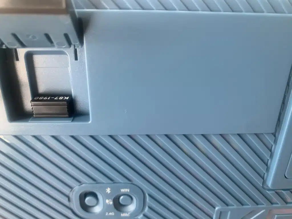 The case features retractable feet with 2 height settings. Underneath the right foot, the 2.4GHZ dongle is hidden ingeniously, and can be stored there when not in use. The bottom surface of the keyboard also contains a WIN/MAC toggle which is interesting, along with the typical mode-switching toggle (Between wired, BT & 2.4GHZ)